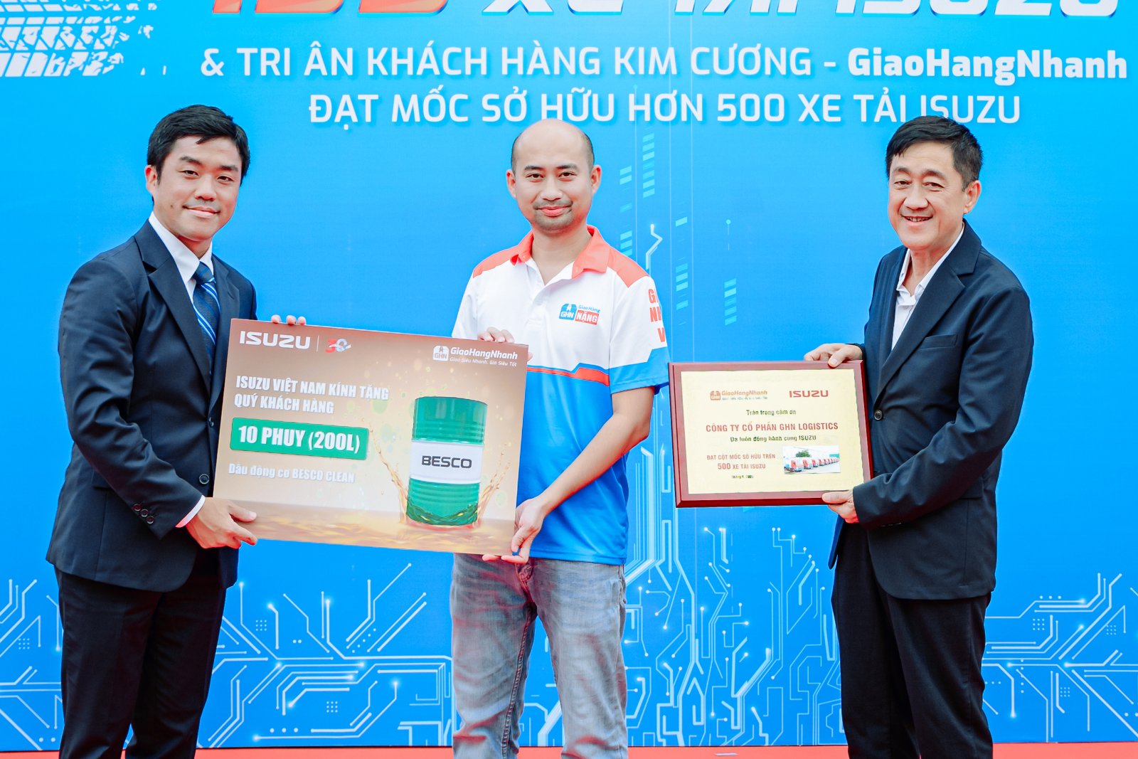 Việc bàn giao thêm 153 xe đã nâng tổng số xe ISUZU trong đội xe GHN lên trên 500 chiếc. Đánh dấu cột mốc ý nghĩa này, ISUZU Việt Nam đã vinh danh GHN với Chứng nhận Khách hàng Kim Cương, cùng phần quà kỷ niệm – 2,000 lít dầu động cơ Besco Clean – như lời tri ân cho sự tin tưởng và đồng hành bền chặt của GHN trong thời gian vừa qua.